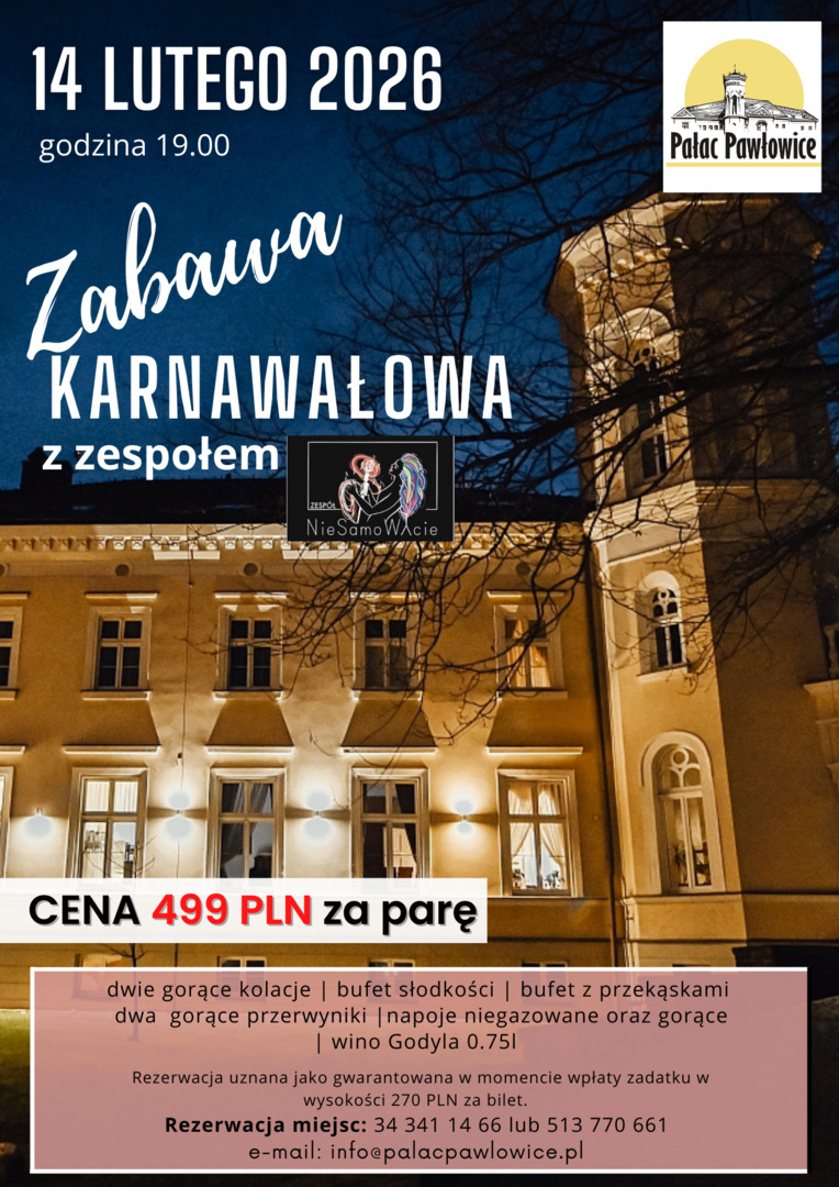 ✨ 14 lutego zapraszamy do Pałacowej Oranżerii na wyjątkową Zabawę Karnawałową! Czeka na Was niezapomniana atmosfera, muzyka do tańca i bogate menu, które podkreśli smak tej wyjątkowej nocy.